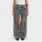 - Design unique en maille transparente : Une touche de tendance qui réinvente le denim classique.